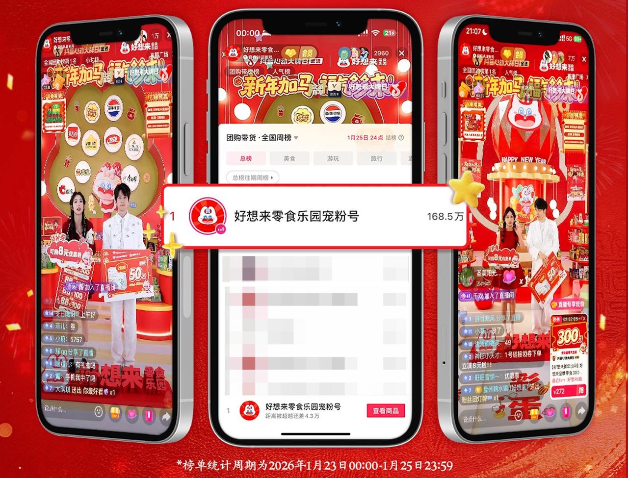 有了好价格,还要有好体验。好想来这次把直播间彻底“玩”出了新花样,不再是简单的讲解和上链接,而是打造成一个充满年味的“春晚式”综艺现场。品牌构建了“明星代言人空降主官号”“多场景主题官播”“超头达人分会场”的直播矩阵,实现声量聚合与高效转化,驱动成交集中爆发,创下最高单场直播场观突破22万+的亮眼成绩。