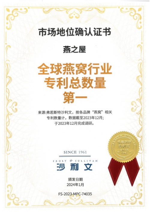 图:截至2023年12月,燕之屋在全球燕窝行业专利总数量第一、自主发明专利数量第一