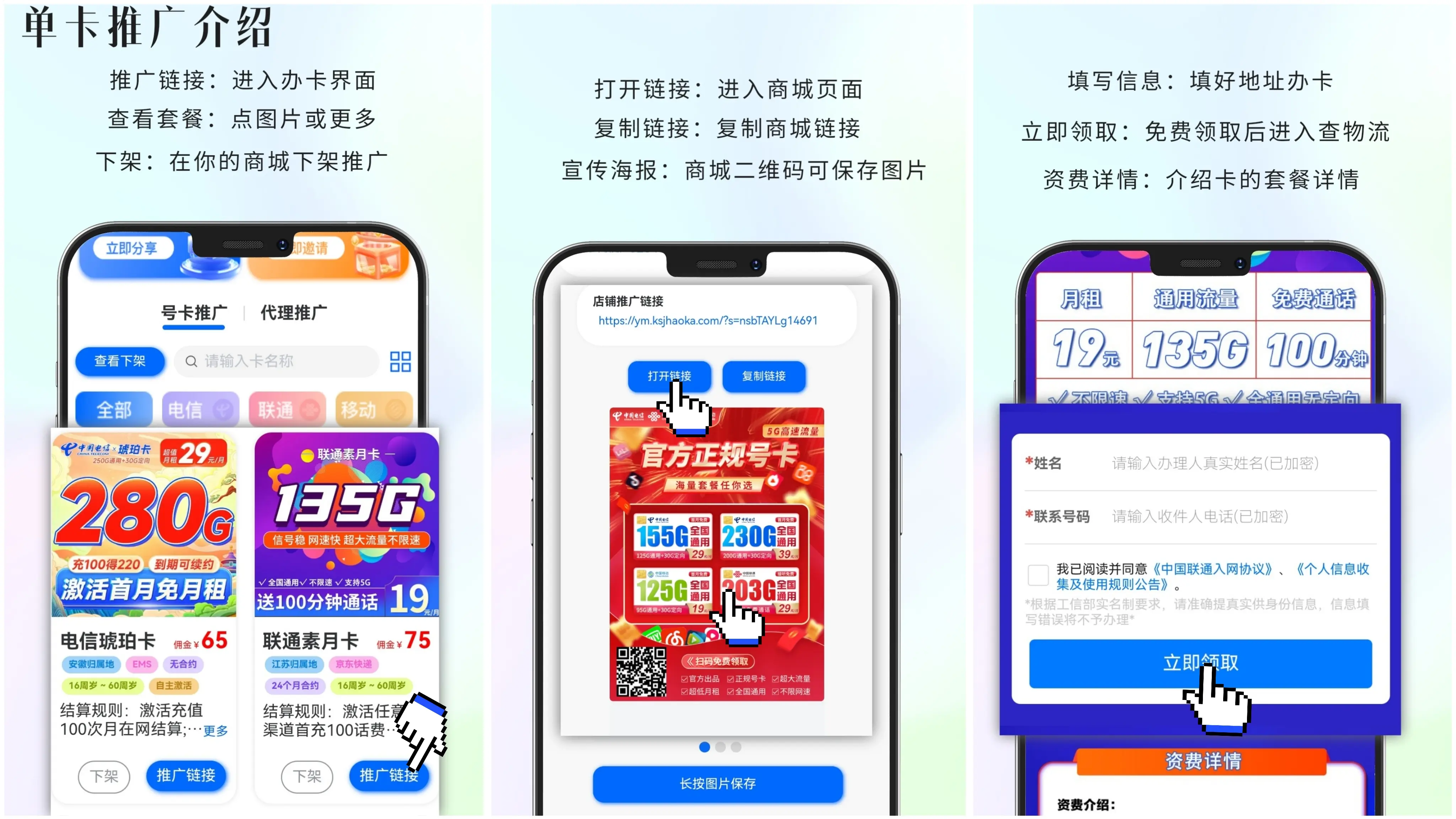 点店铺分享,即可进入号卡推广分享页打开链接,复制链接、一键生成海报、分享办卡页面都可以进入你的办卡商城,办卡自动发货、激活后拿到佣金。
