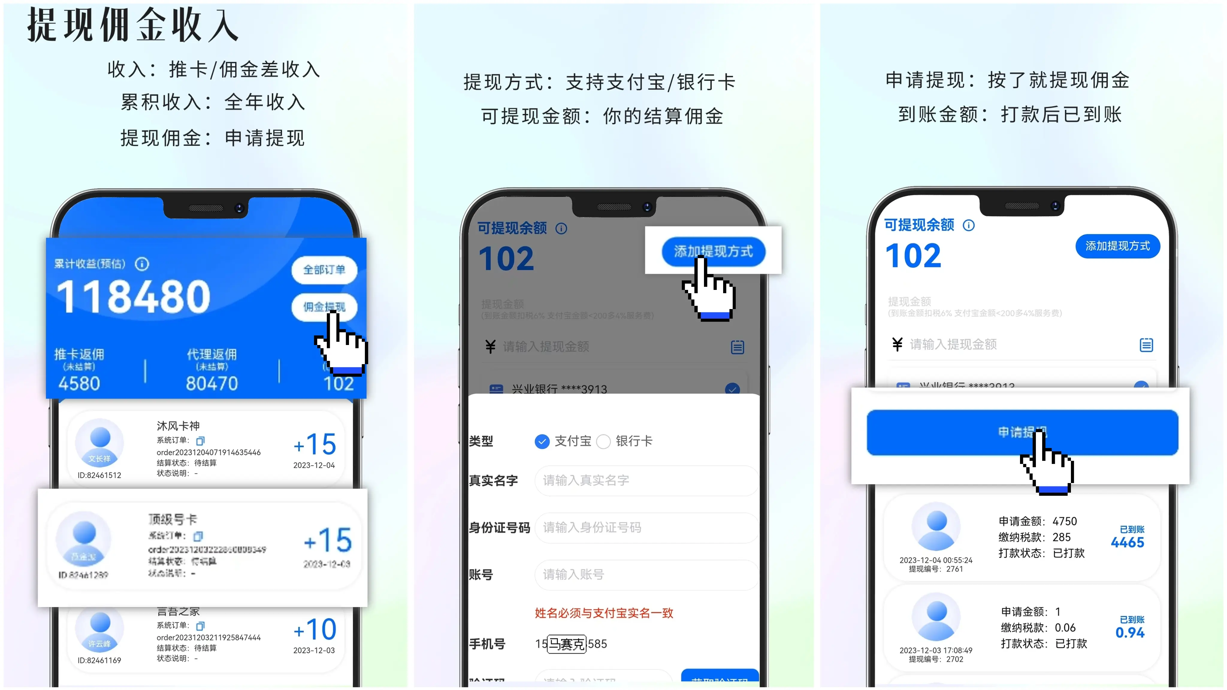 申请提现:已结算佣金可以绑定支付宝/银行卡提现