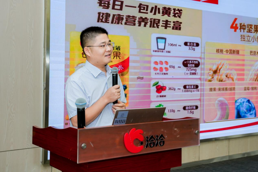 参观结束后,洽洽坚果学院的专业导师为大家带来了一堂别开生面的“坚果”科普课程,通过生动有趣的讲解,让大家了解洽洽小黄袋每日坚果的营养价值、严选标准及种植文化等,让在场学子深刻认识到洽洽坚果的营养奥秘,也提升了大家的“营养素养”。同时,洽洽为本次研学游学子们准备了一份特别的礼物——洽洽将承包他们一整年的每日坚果,即是对学子们青春奋斗的肯定,也是对未来旅程的温馨陪伴。