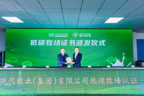 同时,中国船级社质量认证有限公司依据《规模化奶牛养殖场低碳评价技术规范》对现代牧业(集团)有限公司进行了严谨、规范的评估,根据评估结果,对现代牧业(集团)有限公司进行了“低碳牧场”的认定,由中国船级社质量认证有限公司北京分公司总经理刘锋现场颁发“低碳牧场”认定证书。
