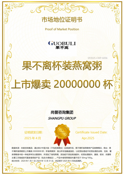 2025年4月,尚普咨询集团有限公司(以下简称“尚普咨询集团”)对杯装燕窝粥市场进行深度调研,经专家和企业调研以及终端销售渠道交叉验证后,给安徽果不离生物科技有限公司颁发了 “杯装燕窝粥上市爆卖20000000杯”,“杯装燕窝粥全国销量领先”的市场地位证书。